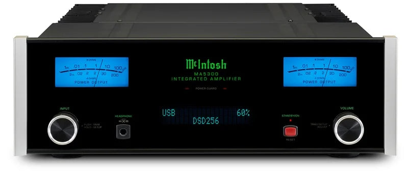 Compact Yet Powerful: The MA5300 is McIntosh’s smallest solid-state integrated amplifier, delivering big sound in a compact form. Impressive Power Output: A direct-coupled amplifier providing 100 Watts per channel into 8 Ohms or 160 Watts per channel into 4 Ohms, with dual-scale blue Watt meters for accurate power readouts. Versatile Connectivity: Features 12 inputs, including 6 analog (4 unbalanced, 1 balanced, and 1 Moving Magnet for turntables) and 6 digital inputs (2 coaxial, 2 optical, 1 USB, and 1 MCT for SACD/CD transports). Future-Ready Digital Audio: Equipped with the DA1 Digital Audio Module, housing an 8-channel, 32-bit DAC in Quad Balanced mode, supporting DSD256 and DXD 384kHz playback. The DA1 is modular and upgradable as digital audio technology evolves. User-Friendly Customization: Input names can be personalized for streamlined system control and ease of use. Innovative McIntosh Technology: • Monogrammed Heatsinks™ connected to high-current output transistors for instant performance without warm-up. • Powerful new microprocessors and advanced audio-grade circuit components for exceptional sound quality. • Bass and Treble Tone Controls to tailor your music to personal preferences. Roon Tested: Certified for seamless integration with Roon software, ensuring optimized audio playback and effortless configuration. Advanced Features for Versatility: Includes McIntosh technologies like Power Guard®, Sentry Monitor™, Home Theater PassThru, and High Drive headphone amplifier with Headphone Crossfeed Director (HXD®). Classic McIntosh Aesthetic: Signature blue Watt meters, black glass front panel, aluminium end caps, control knobs, illuminated logo, and gold-plated speaker binding posts complete its timeless design.